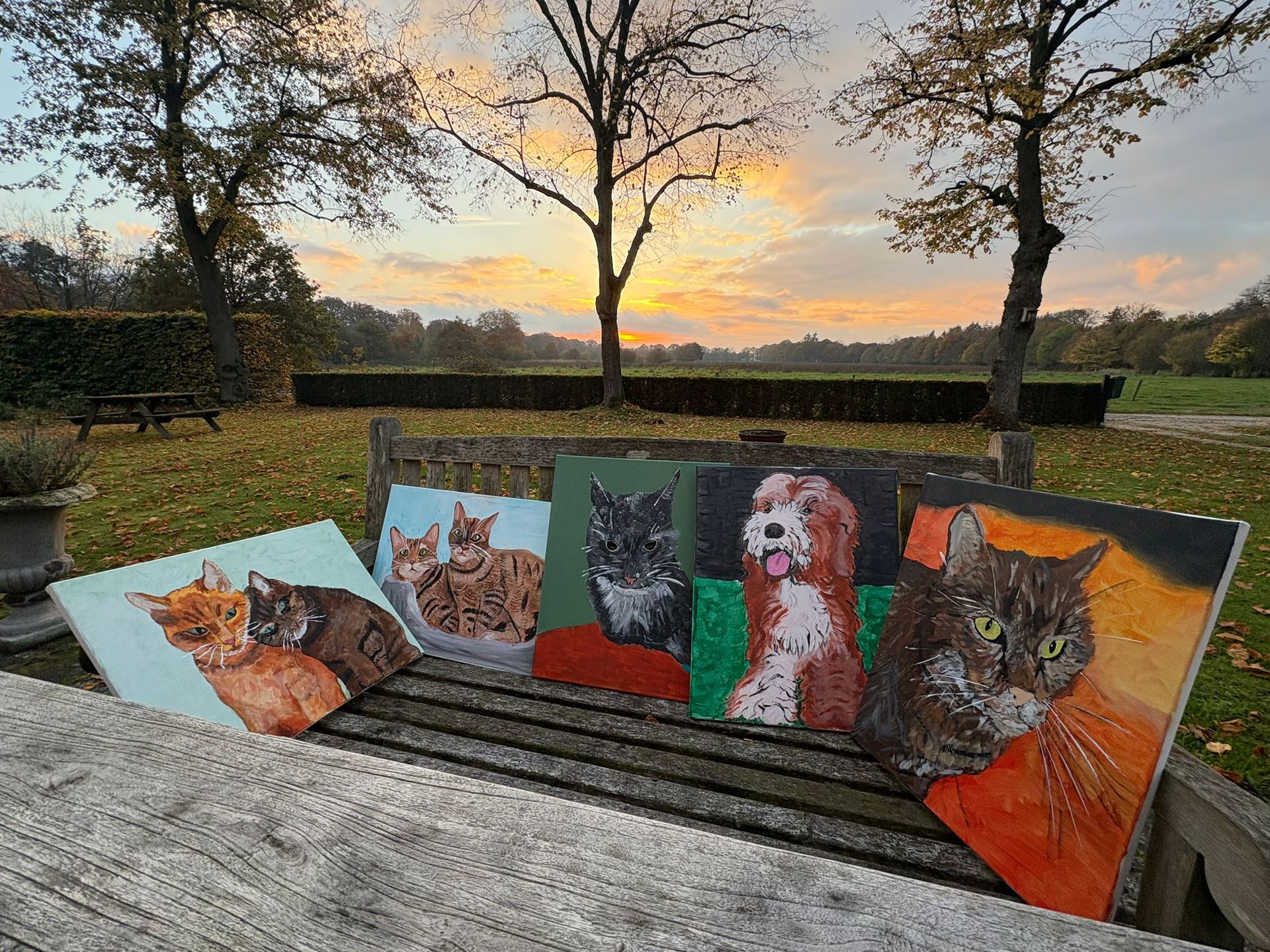 Je mailt een leuke foto van tevoren naar mij en dan zet ik jouw foto met potlood op een schilderdoek. Je hebt dan een basistekening waar je zelf mooie zelfgekozen kleuren overheen kunt schilderen.